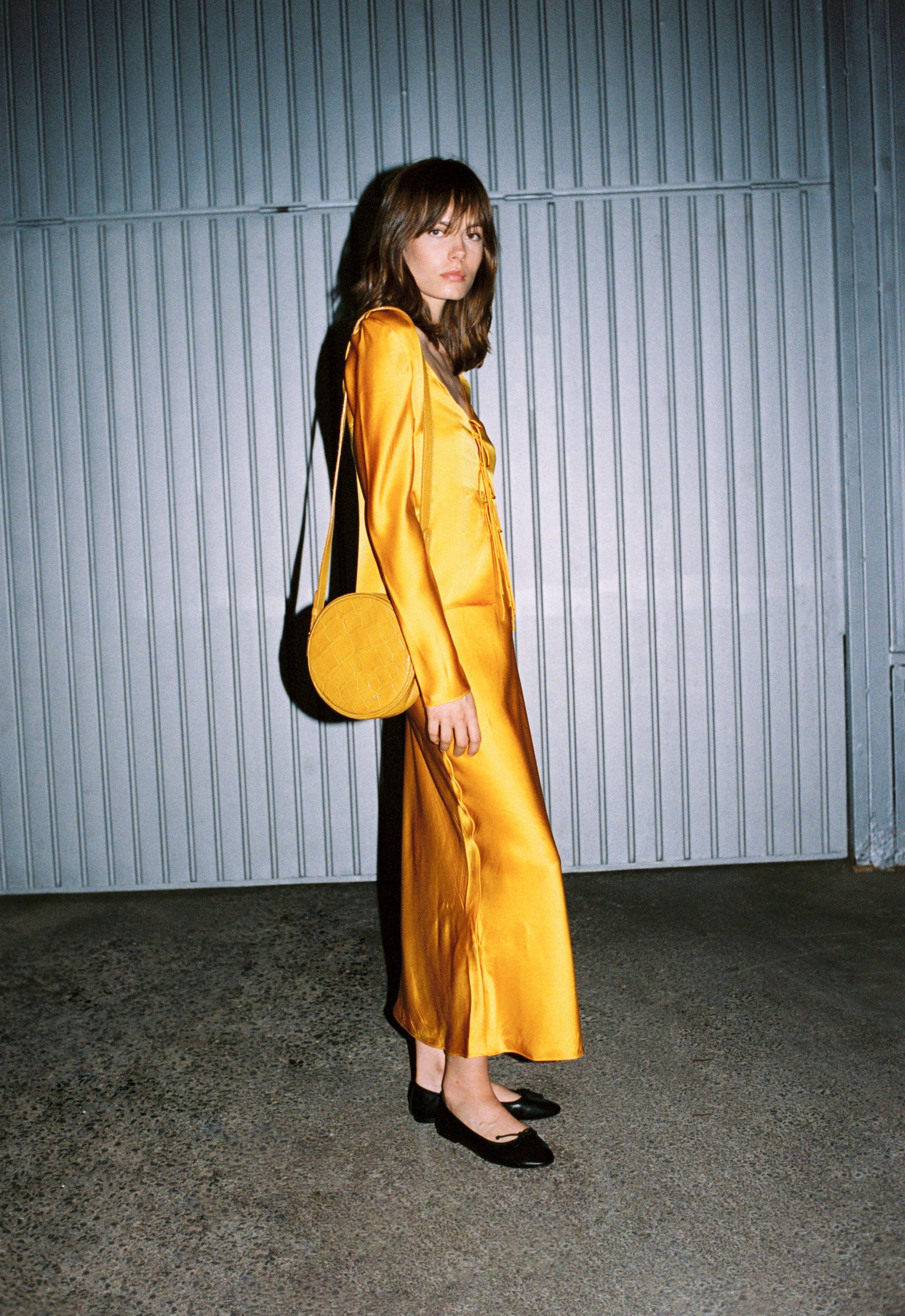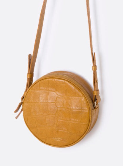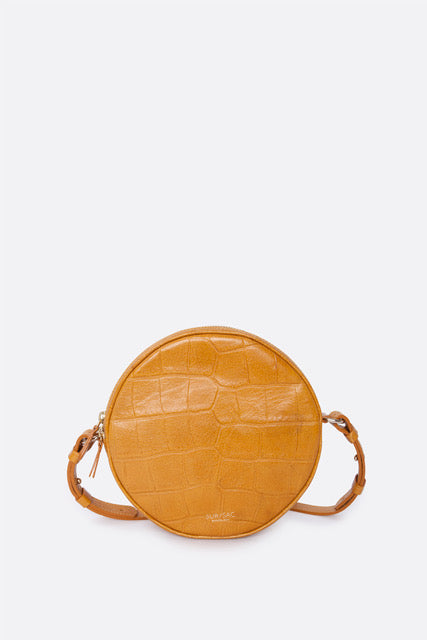 Bolso en forma redonda, realizado en piel de vacuno con grabado de cocodrilo.
