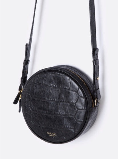 Bolso en forma redonda, realizado en piel de vacuno con grabado de cocodrilo.