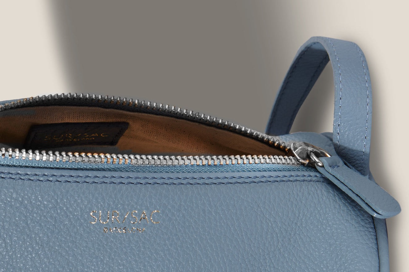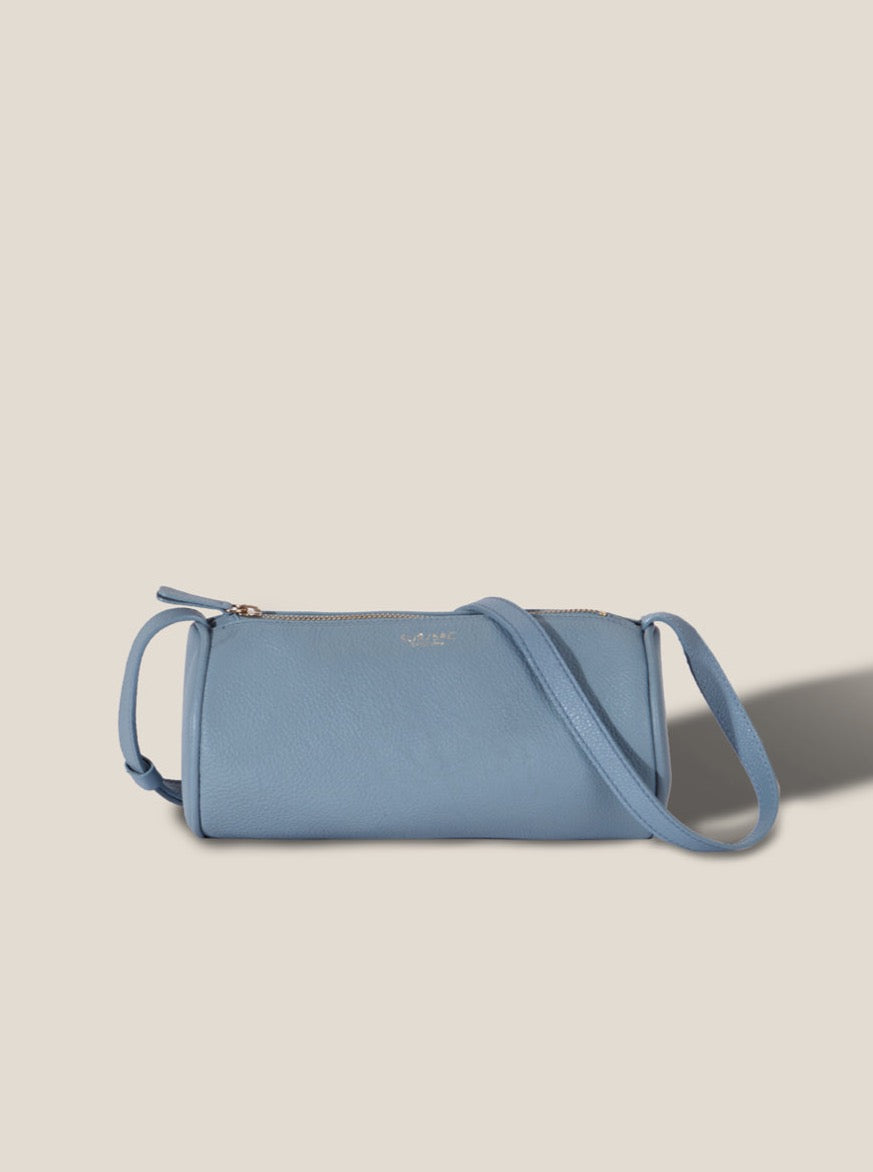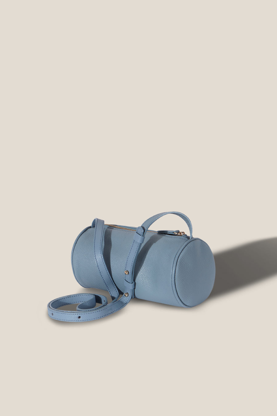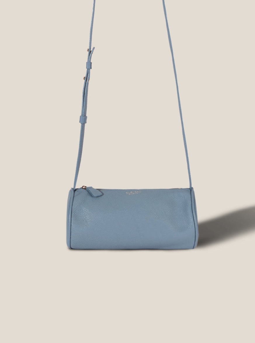 Bolso con forma cilíndrica realizado en piel de vacuno con grabado de cocodrilo.