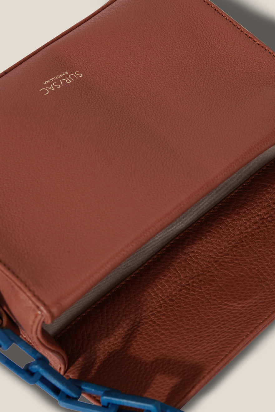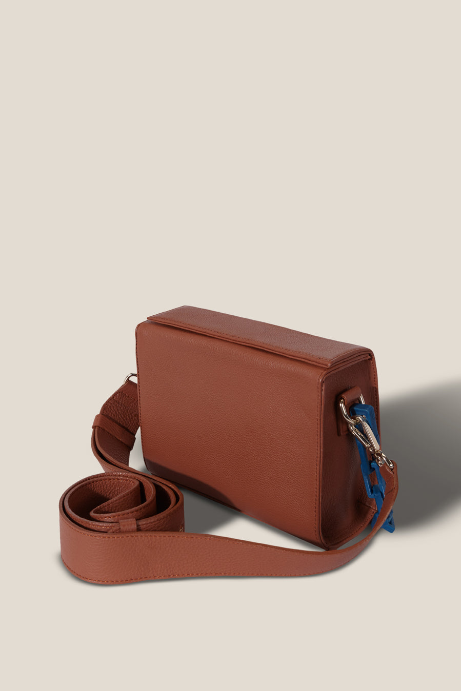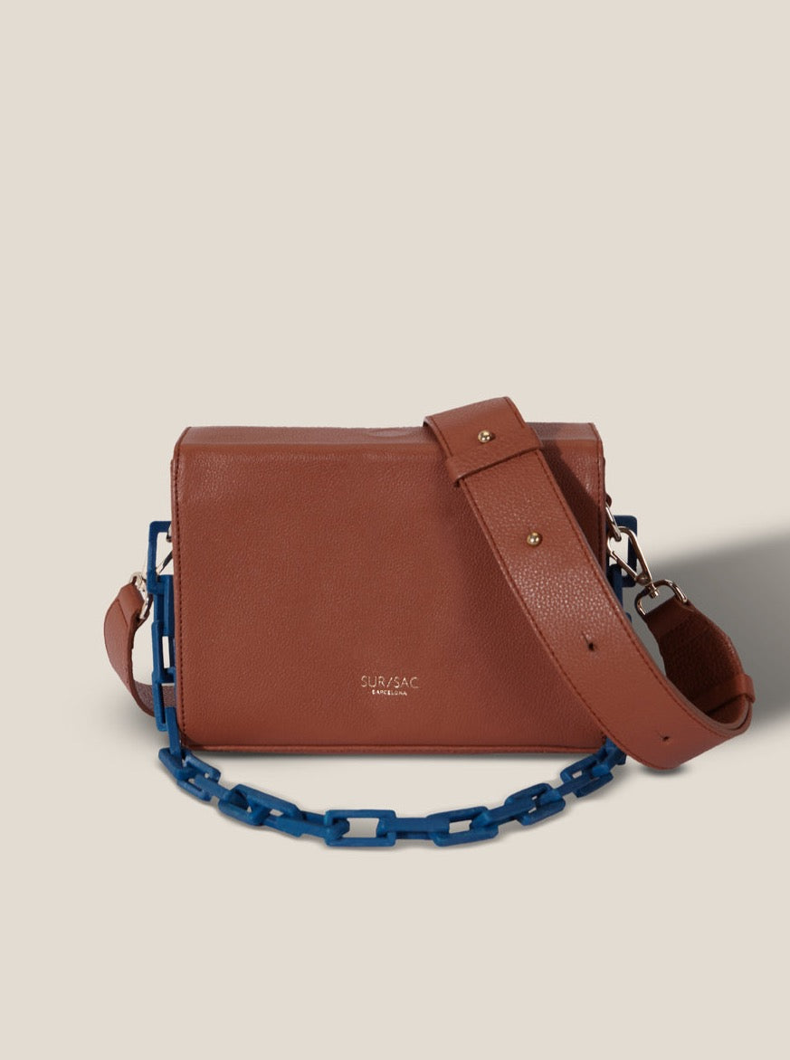 Bolso en forma de caja realizada en piel de vacuno en color tabaco.
