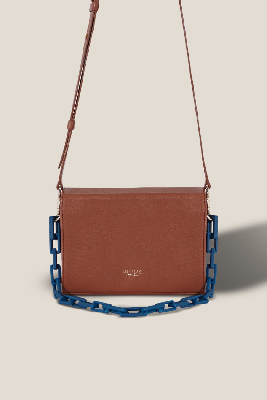 Lleva dos asas, una asa bandolera regulable al tono del bolso de 116 cm con gemelos en oro claro. Asa extraíble de 56 cm realizada en 3D, en forma de cadena en color azul.