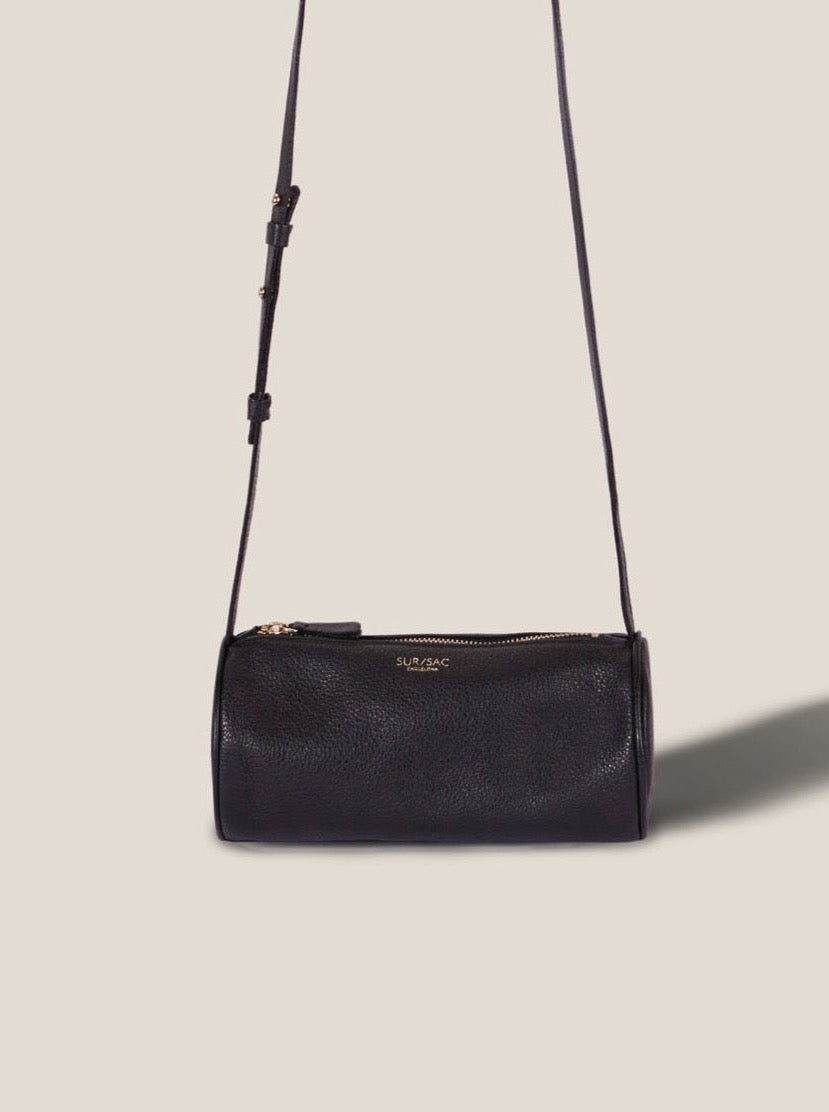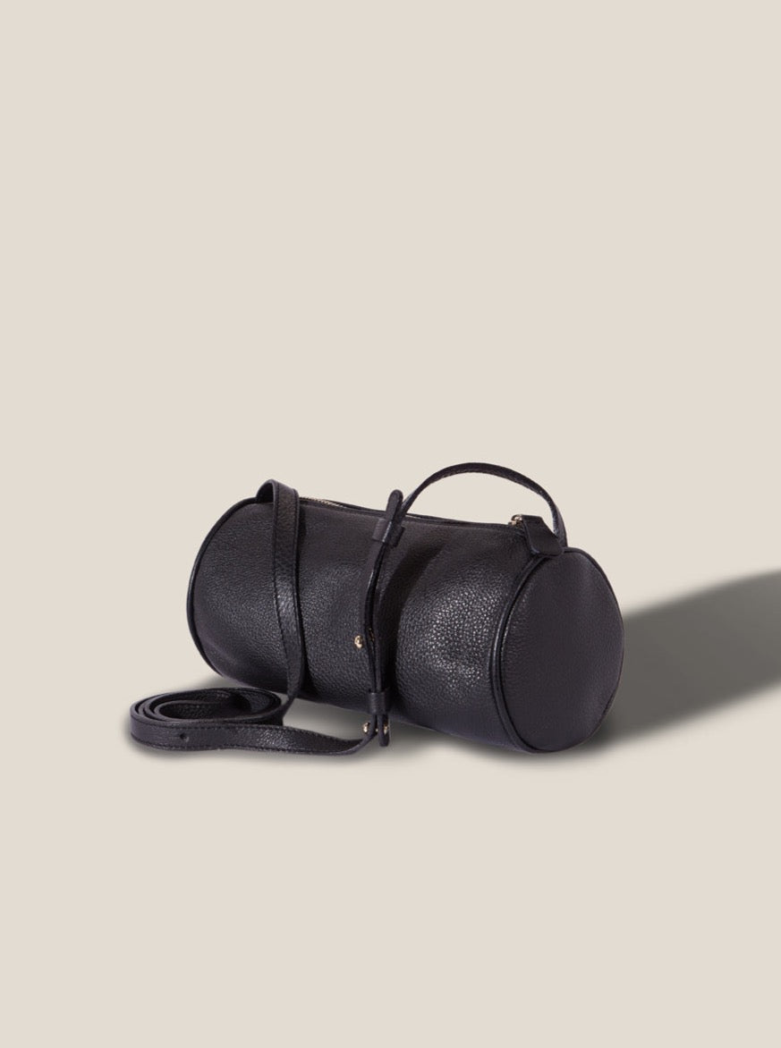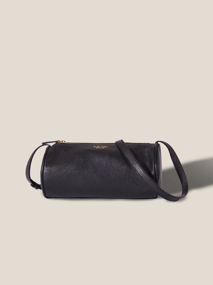 Bolso con forma cilíndrica realizado en piel de vacuno con grabado de cocodrilo.